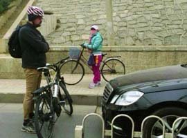 Auto gegen Rad: "Nicht mit mir!", dachte sich wohl dieser Ausländer, als ein hupender Mercedes versuchte, ihn vom Radweg zu verscheuchen. Er bot dem Fahrer demonstrativ Paroli. Ein Passant beobachtete die Szene und stellte die Bilder ins Netz.