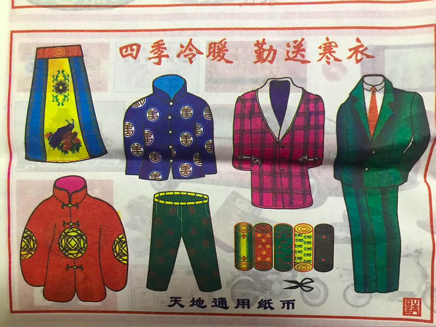 Funktion / 功能 Durch das Verbrennen der Papiergaben den Göttern und Ahnen opfern, den Verstorbenen gedenken und ihnen Geschenke ins Jenseits senden 供人焚烧用来祭神拜祖,悼念死者,送给已故亲人在阴间使用 Wann verwendet / 什么时候烧 Todestage von Verwandten, Qingming-Fest, Geisterfest, chin. Silvester usw.; an Gräbern tagsüber verbrannt, andernorts nach Sonnenuntergang 亲属忌日、清明节、鬼节、除夕等,去上坟就白天烧,不上坟一般在天黑之后烧 Wo verbrannt / 在哪里烧 An Gräbern von Verwandten und an Straßenkreuzungen 已故亲属坟墓或十字路口 Worauf ist zu achten / 需要注意什么 Stock zum Zusammenhalten der Asche mitbringen; Opferstelle erst nach Erlöschen der Glut verlassen; um Opferstellen auf der Straße einen Bogen machen und nicht darauf treten 带一根棍子把灰烬粘在一起,火灭后才离场,路上遇到烧纸尽量绕开走,不要踩到 Standardpapieropfer / 传统烧纸品 Papiergeld, Gold- und Silberbarren, Papierkleidung, Zigaretten, Schnaps 纸币、金元宝、银元宝、纸衣服、香烟、白酒 Ausgefallene Opfergaben / 特殊纸扎品 KFC-Menü, Waschmaschine, elektrischer Rasierer, Mahjong-Tisch, Massagesessel, Smartphone, Sportflitzer, Villa 肯德基套餐、洗衣机、电动剃须刀、麻将机、按摩椅、智能手机、跑车、别墅 |