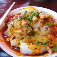 凉皮 - liángpí - n kalte Reisnudeln Ein kalter Snack, der ursprünglich aus der Provinz Shaanxi (陕西 Shǎnxī) stammt und vor allem in Nordchina beliebt ist. Die weich-glibrigen Reisnudeln, die gerne vom Esstäbchen gleiten, werden mit Essig, Öl, Erdnüssen, Gurken und weiteren Zutaten angemacht und vor dem Verzehr gründlich vermengt. |