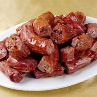台式烤肠 - táishì kǎocháng - n Grillwürstchen nach Taiwaner Art Wie der Name schon sagt, stammt dieser Snack ursprünglich aus Taiwan, ist mittlerweile aber auch auf dem Festland überaus beliebt. Die leicht süßlich schmeckenden Würstchen werden an vielen Zeitungskiosken am Straßenrand angeboten, wo sie zuvor auf kleinen Elektrogrills ihre Runden drehen, bevor sie als deftiger Snack am Spieß verzehrt werden. |