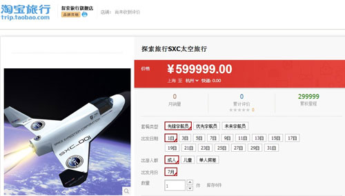 现在,在淘宝上都可以订去太空的旅行啦!6月12日,在中国最大的购物网站淘宝网上,私人太空游正式开始销售。此次淘宝旅行与美国太空探险公司SpaceX (Space Exploration Technologies Corporation)合作,在中国首次推出了私人太空游。
